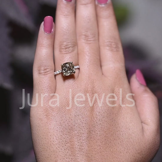 Unique Champange Hidden Halo Cushion Cut Engagement Ring